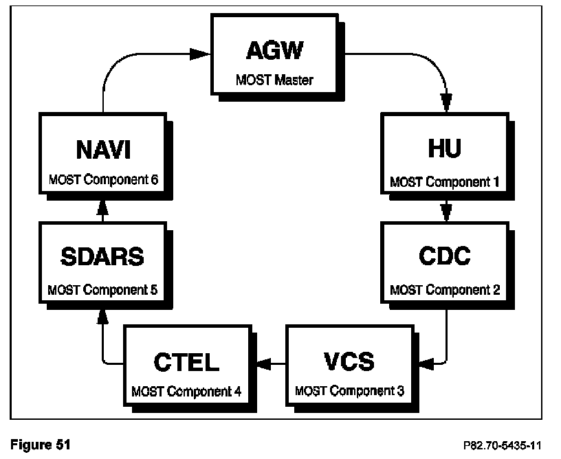 Control units > Information and communication > Audio, video, navigation and telematics > AGW - Audio Gateway > Retrofitting of MOST components or iPod > Retrofitting of MOST components > F2: Restart of optical ring > F2: Actual configuration > Verify that "Telecommunications" and "Voice control system" (depending on installation) is listed under Actual Value and configuration of the MOST components matches that of Figure 51 > F2: To continue > F3: Yes, to write the current actual configuration to MOST master > F2: Erase fault memory Note: The MOST ring configuration in Figure 51 is an example of a configuration including all possible components. Some installations will not include all the components shown in the example. If a component is not present, connect the preceding component to the component following the one not present.