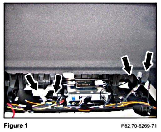 14. Insert the tabs at the bottom of the false floor (Arrows, Figure 43) into the two cavities (Arrows, Figure 45) in the floor, rear of the partition in the center console compartment.