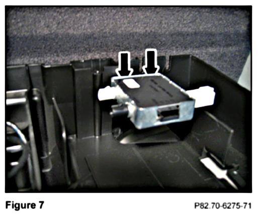 8. Reconnect the Tele Aid/Roadside Assistance button assembly and reinstall the assembly exposing the power supply and FAKRA connectors through the cutout (Figure 42).