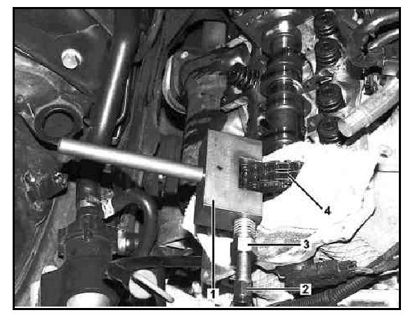 2 Fit the chain separating tool (1) with the pressure screw (2) at the chain link to the right of the copper plate on the timing chain (4).