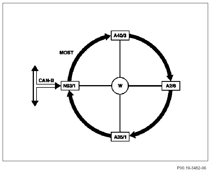 The radio or the COMAND operating, display and control unit forms the interface (gateway) for data exchange between the MOST and CAN-B. The central gateway control unit (N93) is the interface for data interchange between the CAN B bus and CAN C bus. At the same time, it is the interface via CAN-D to the data link connector X11/4), in order to test the control units connected to the different bus systems using STAR DIAGNOSIS.