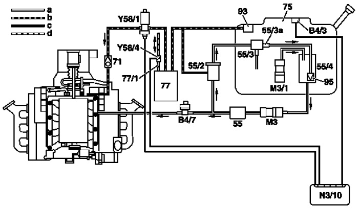 The activated charcoal canister shut-off valve (Y58/4) is closed and the purge control valve (Y58/1) opened. The vacuum in the intake manifold reaches the fuel tank (75).
