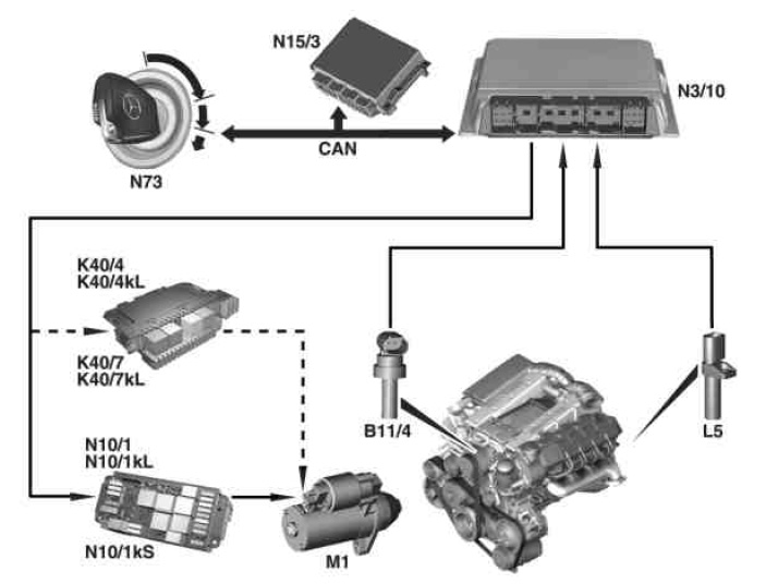 By actuation of the ignition in the start position, the ME control unit receives the "tml. 50 signal" from the EIS control unit via the CAN data bus. Start control is carried out automatically by the ME control unit (touch start).