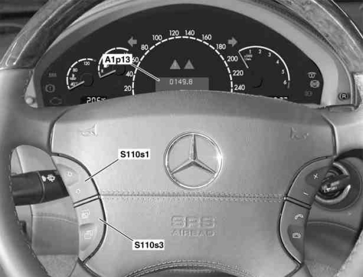 3 Press the scroll back and forward button (S110s1) repeatedly until "CORRECT MEASUREMENT ONLY WHEN VEHICLE IS STATIONARY AND ON THE LEVEL" appears in the multifunction display (A1p13).