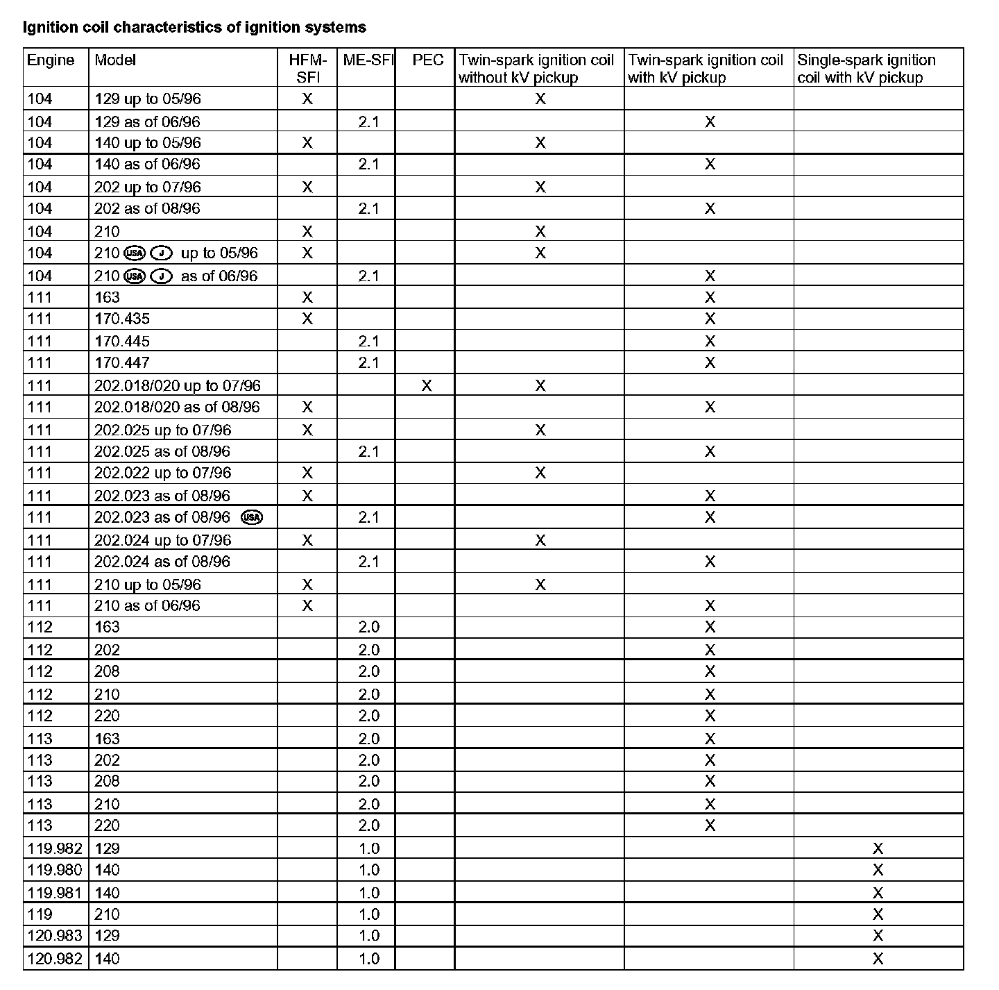 In the case of the twin-spark ignition coil with kV pickup in ignition systems ME-SFI 2.1 and HFM-SFI, no measurement facility exists at the ignition coil using the kV pickup although a kV pickup is fitted. It is only possible to test the primary ignition circuit with adapter cable A.