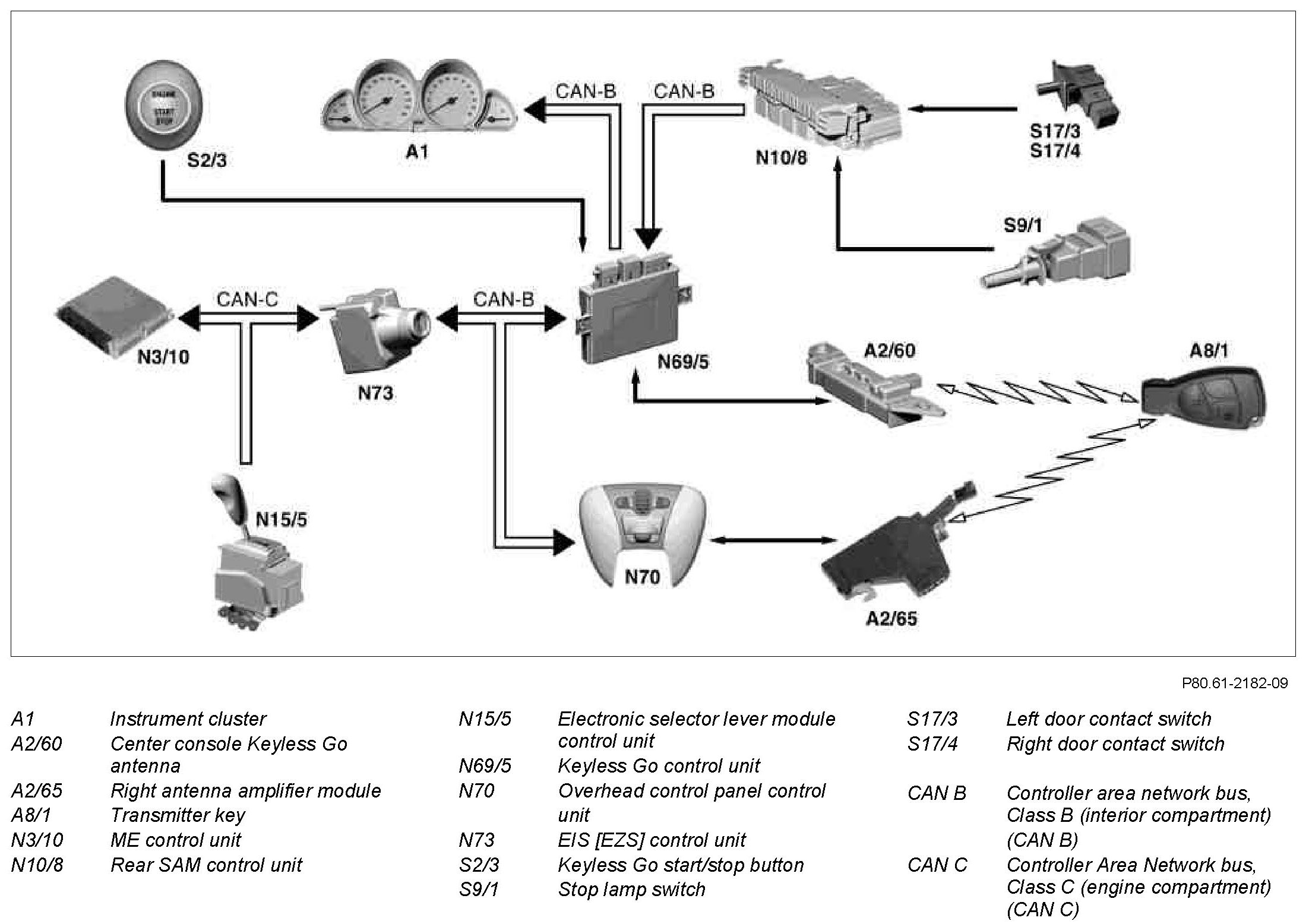 If the Keyless Go start/stop button (S2/3) is pressed on the selector lever, a signal is transmitted to the Keyless Go control unit via a discrete line.N69/5 It requests the transmitter key to transmit its drive authorization code via the center console Keyless Go antenna A8/1A2.