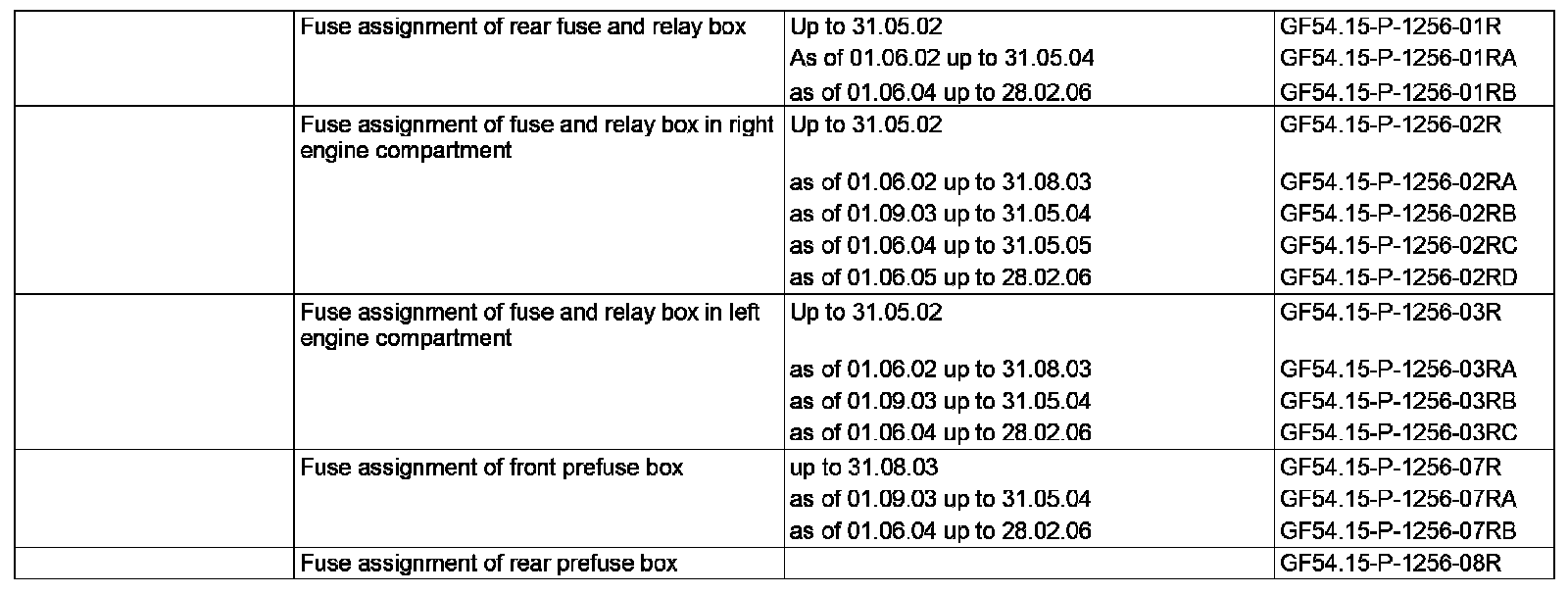 GF54.15-P-1256R Fuse Assignment, As-built Configuration