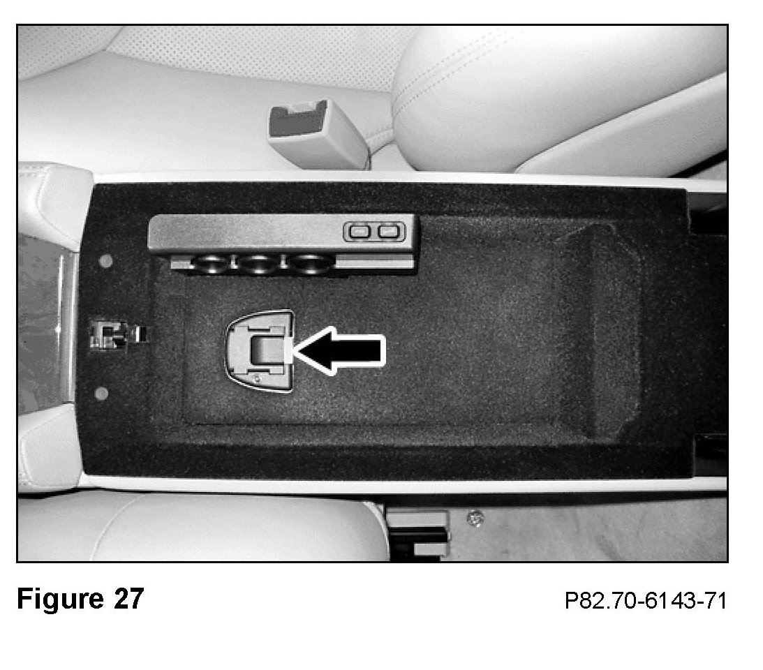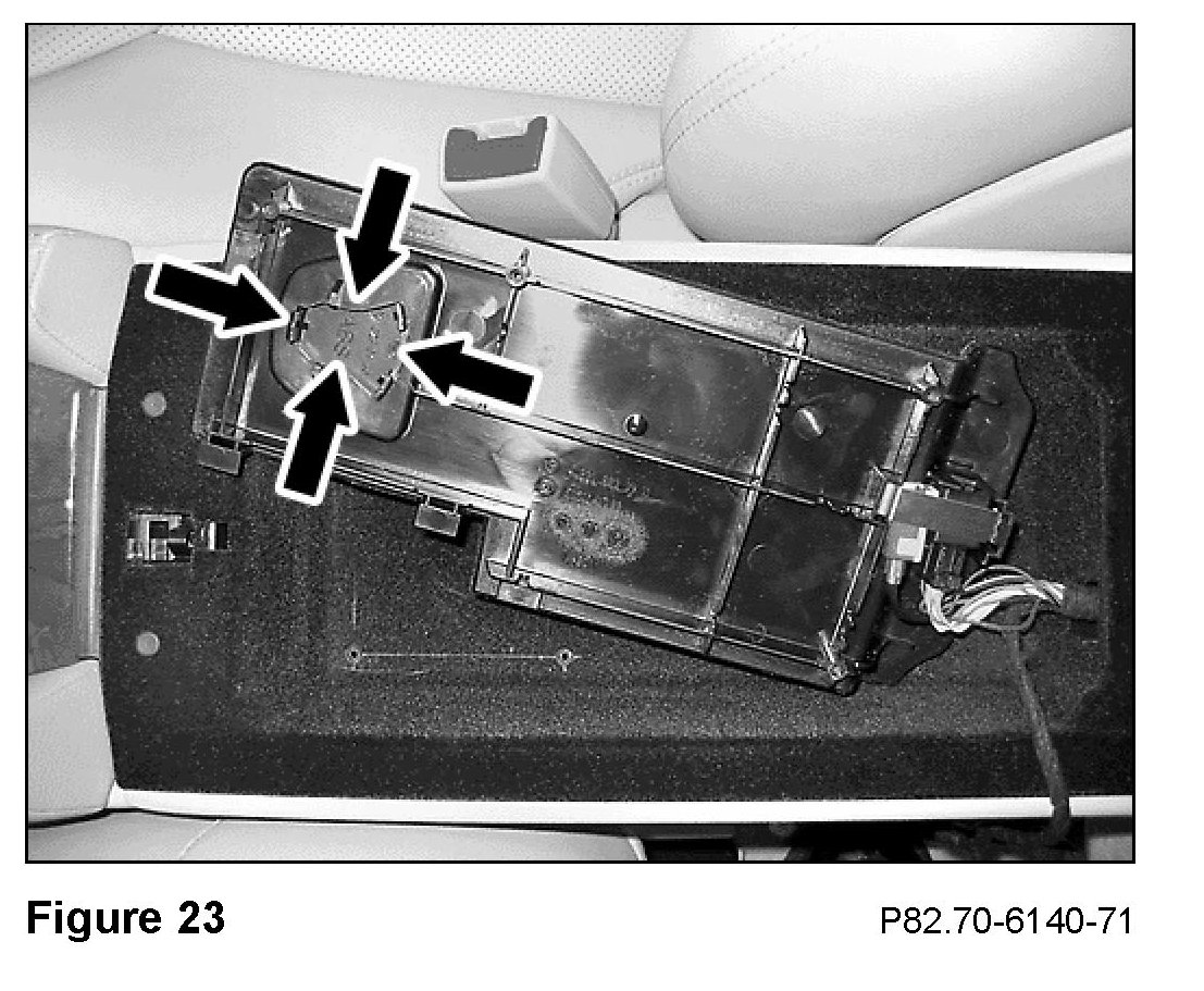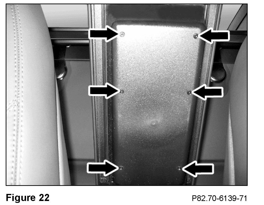 F. Installing the contact plate and cradle1. Open the lower compartment of the center console and remove the six T10 Torx screws (Figure 22) on the upper compartment underside securing the false floor.