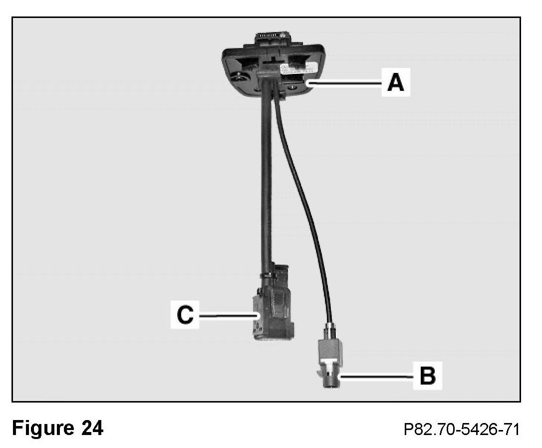 5. Find the kit-included contact plate (A, Figure 24) and identify the FAKRA antenna male connector (B, Figure 24) and the power supply male connector (C, Figure 24).