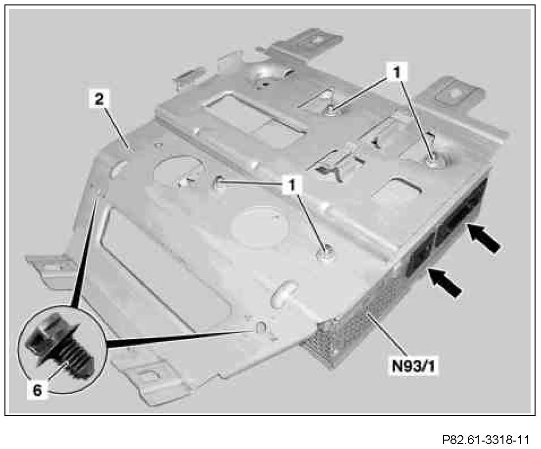 2 Attach audio gateway control unit (N93/1) with nuts (1) on the bracket (2).