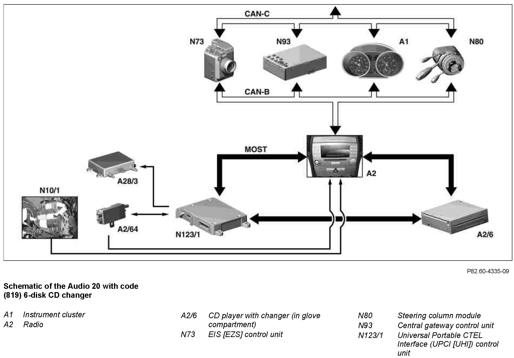 The control signals from the radio (A2) as well as the audio data from the CD player with changer (in the glove compartment) (A2/6) are transmitted via the Media Oriented System Transport (MOST). The signals are processed and amplified by the radio (A2). The CD player with changer (in glove compartment) (A2/6) is activated in the "Audio/CD" menu of the radio (A2).