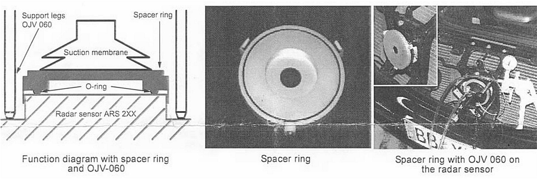 To create the necessary suction vacuum, a spacer ring (part number OJV-065) is fitted over the antenna lens surface. This allows the Distronic Adjustment Device to be positioned in the usual way and the necessary suction vacuum can be produced on the antenna lens surface (see figures shown).