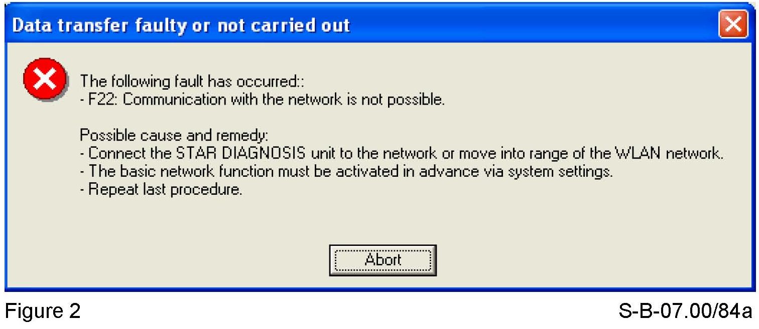 If you receive the below message box (Figure 2), it is because the control unit log has failed to transmit. This is because your Star Diagnosis System is not finding the internet through your network. Control unit logs can only be transmitted by SDS units which have access to the internet for SCN Coding. Please check your entire network settings on your SDS unit and attempt to retransmit the log using the procedure found later in this document. Control unit logs once generated are kept on the SDS unit until they are manually deleted.