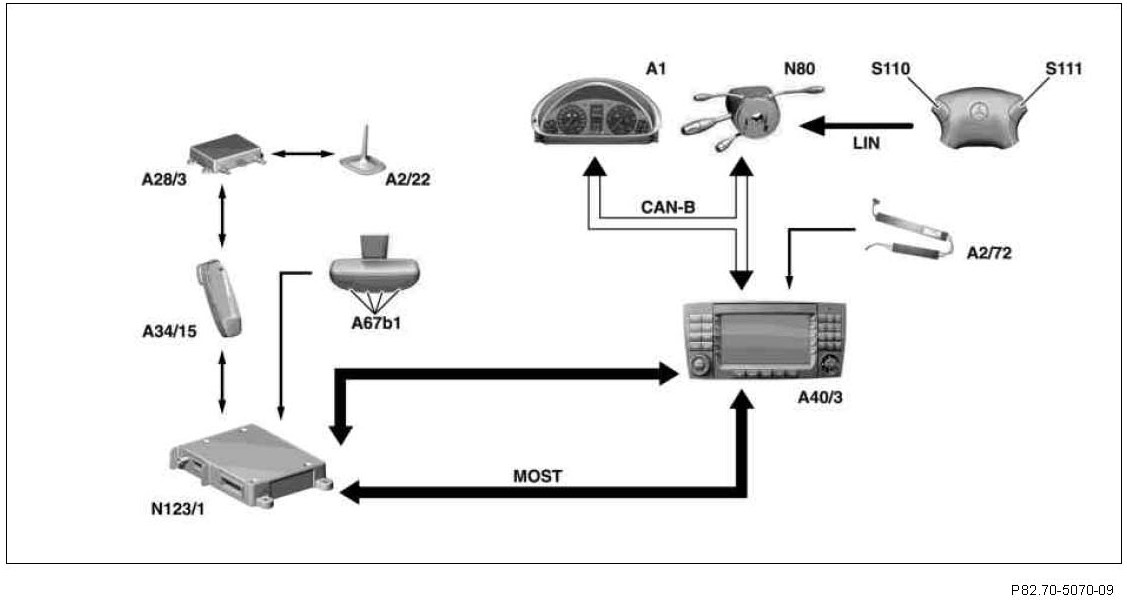 All control signals and useful signals (e.g. sound signals with handsfree system activated) are transmitted via the Media Oriented System Transport (MOST). For this reason, the portable CTEL (A34/6) requires the Universal Portable CTEL Interface (UPCI [UHI]) control unit (N123/1) as an interface to the Media Oriented System Transport (MOST).