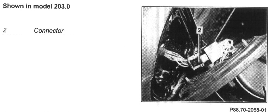 3.1 Open and disconnect connector (2) from left electrically adjustable and heated outside rearview mirror (M21/1), right electrically adjustable and heated outside rearview mirror (M21/2)