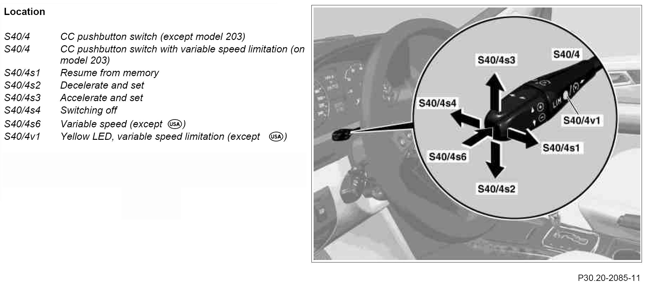 The CC pushbutton switch switches the cruise control functions, Distronic (with Distronic) and variable speed limitation (except (USA)) on and off.