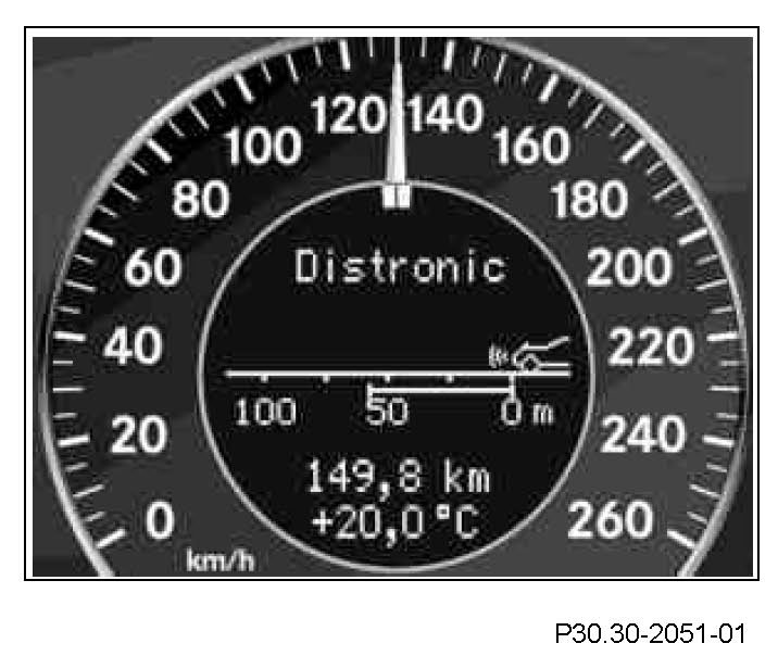 If the separation between the vehicles goes below the nominal separation the separation indicator lamp in instrument cluster lights up. In addition an intermittent signal (takeover signal) sounds. The distance warning lamp remains active even when the Distronic is off. The intermittent signal chime can be deactivated when the Distronic is switched off.