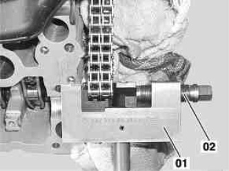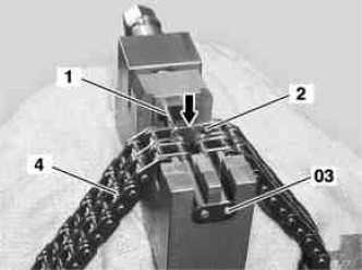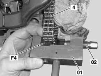 9 Place the rivet press tool (01) in such a way that the spacer webs of the assembly insert (F4) lies on the rolls of the timing chain (4).