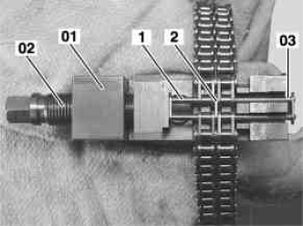 Ensure that the riveted link (1) and the rivet press tool (01) are aligned. While screwing in the pressure screw (02) ensure that the pins of the riveted link (1) are pressed into the holes of the press-fit center plate (2), and that the centering fork (03) that has been squeezed out does not fall into the timing case recess.