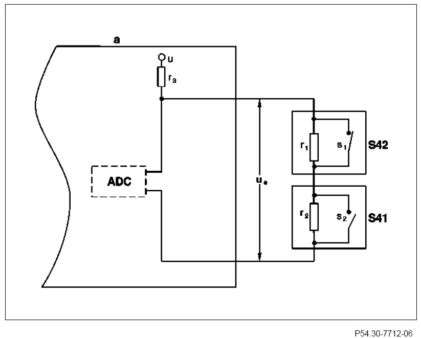 The switch (s1) and the switch (s2) are switched in parallel for voltage coding of resistor (r1) and resistor (r2), the values of resistor (r1) and resistor (r2) must be different. When the switches (s1, s2) are open, these resistors (r1, r2), together with resistor (r3) of the front SAM control unit with fuse and relay module (N10/1), form a voltage divider, which is supplied with the constant voltage (u). The voltage (ue) at the input of the front SAM control unit with fuse and relay module (N10/1) is thus dependent on the positions of switch (s1) and switch (s2) and the values of the resistors (r1, r2, r3). Each switch combination (s1, s2) gives a different voltage value (ue) at the input of the front SAM control unit with fuse and relay module (N10/1).