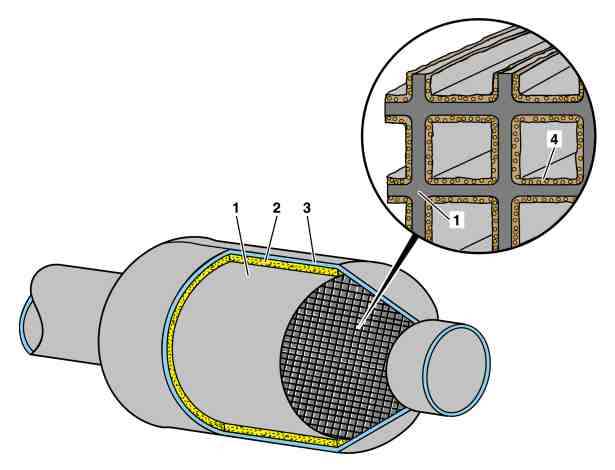 In each catalytic converter, there are two ceramic monoliths with each approx. 600 cells. The exhaust gas flows through these passages. The ceramic consists of high temperature-resistant magnesium aluminum silicate.