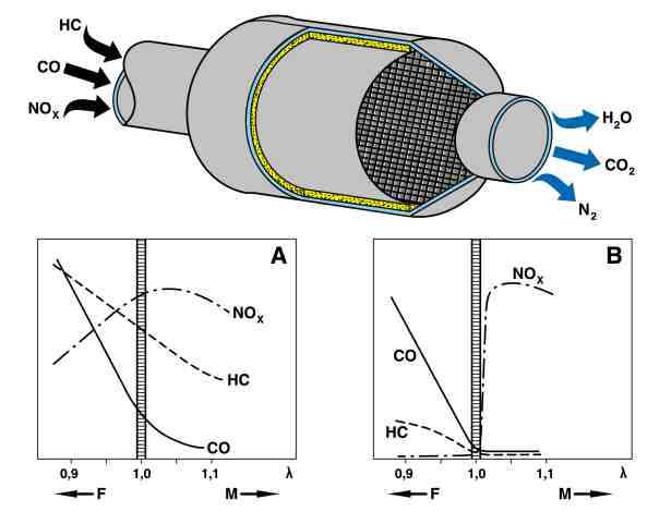 The critical factors for the conversion of the pollutants is the residual oxygen content in the exhaust. It is determined through lambda control and maintained at lambda equals 1 in normal operation.