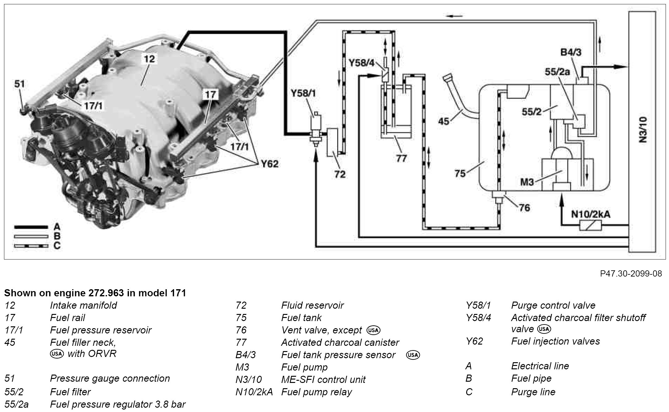 During refueling the fuel vapors are collected additionally from the fuel tank and passed on to the activated charcoal filter (ORVR = Onboard Refueling Vapor Recovery). An activated charcoal canister is used with around 3 liter capacity. The activated charcoal canister shutoff valve (Y58/4) and fuel tank pressure sensor (B4/3) are necessary for the checking the leaktightness.