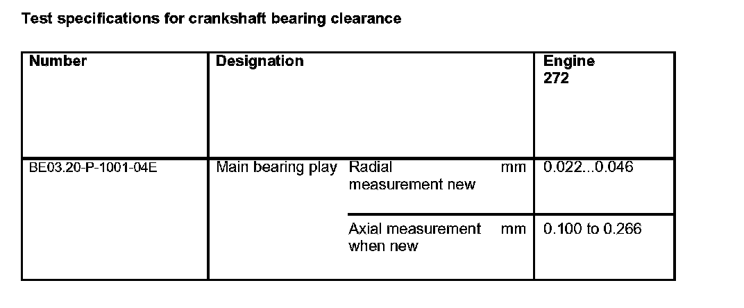 Test specifications for crankshaft bearing clearance: