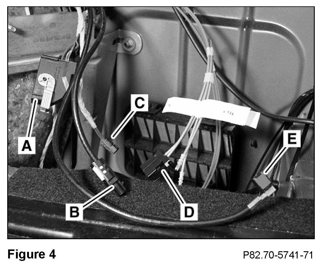 1. In the exposed right side well of the trunk, find the foam-sleeve-covered cable connectors.2. Remove or fold back the foam sleeves to expose the connectors and identify the: