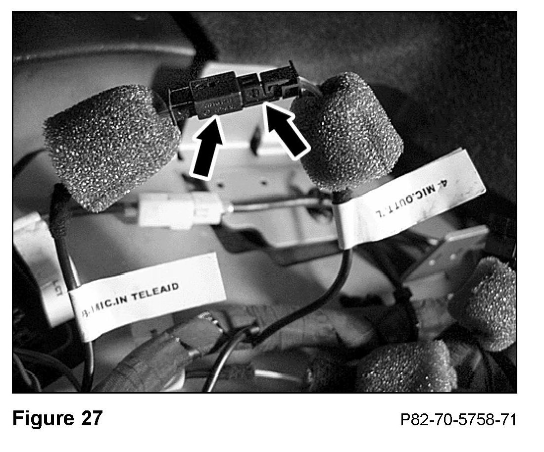 3. If equipped with Tele Aid, connect the 2-pin female connector labeled "4 - MIC.OUT TEL" to the 2-pin male connector labeled "8 - MIC.IN TELEAID") (Arrows, Figure 27).