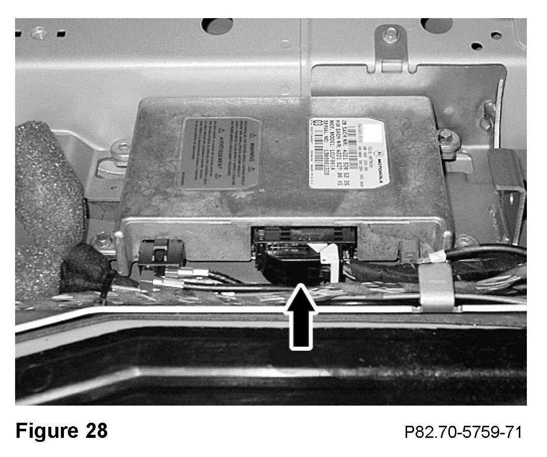 1. At the left side of the exposed electronics compartment at the front of the trunk, disconnect the Tele Aid power supply connector from the Tele Aid control module (Figure 28).
