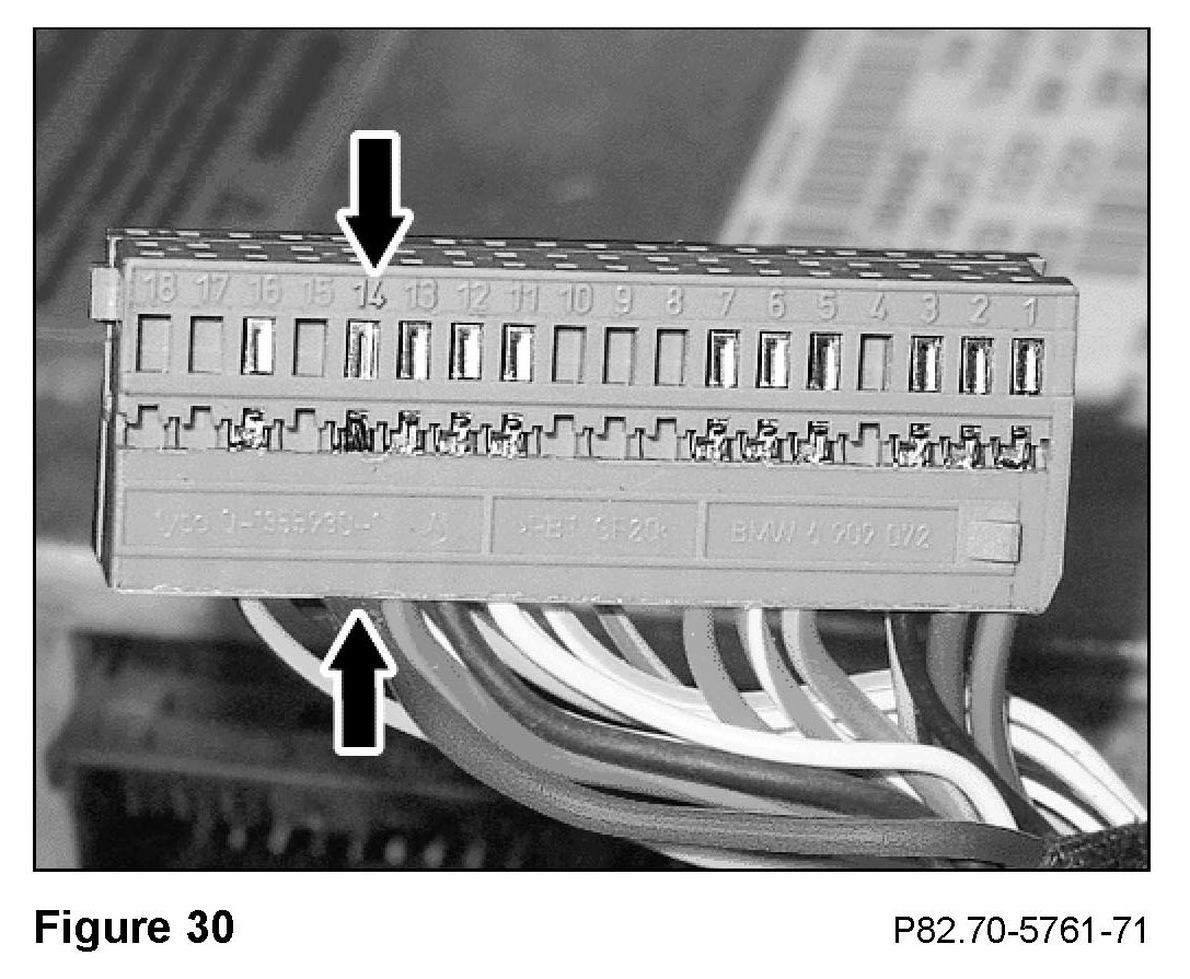 4. If pin # 14 is occupied (Arrows, Figure 30), verify that the violet-color wire coming from pin # 14 goes to: