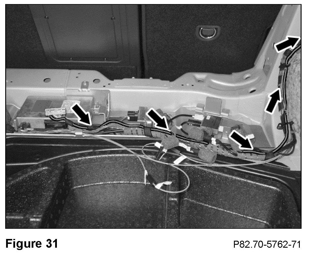 9. Route the 20-gauge, violet-color wire along the main wiring harness from the power supply connector for the Tele Aid control module to the linear compensator (Figure 31).
