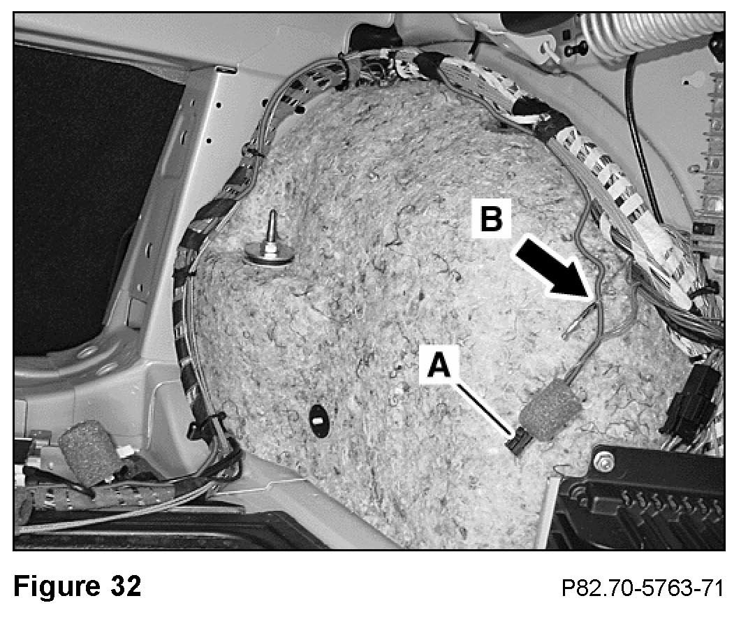 13. Cut the violet-color wire of the power supply wiring harness for the linear compensator halfway between the connector and the point where it branches off the main wiring harness (B, Figure 32).