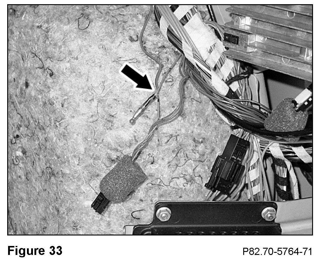 11. Remove the tape from the power supply wiring harness for the linear compensator from the connector to the point where it branches off the main wiring harness (Figure 32).