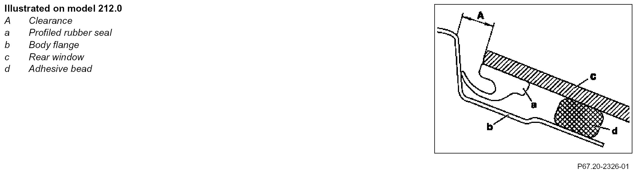 Adjust distance dimension (A) with the aid of the feeler gauge On model 197.3 and model 230.4 with code (P99) Special model "AMG Black Series" the rear window (c) is not adjusted with the feeler gauge but with the help of an assistant is aligned centrally and parallel with the body opening.