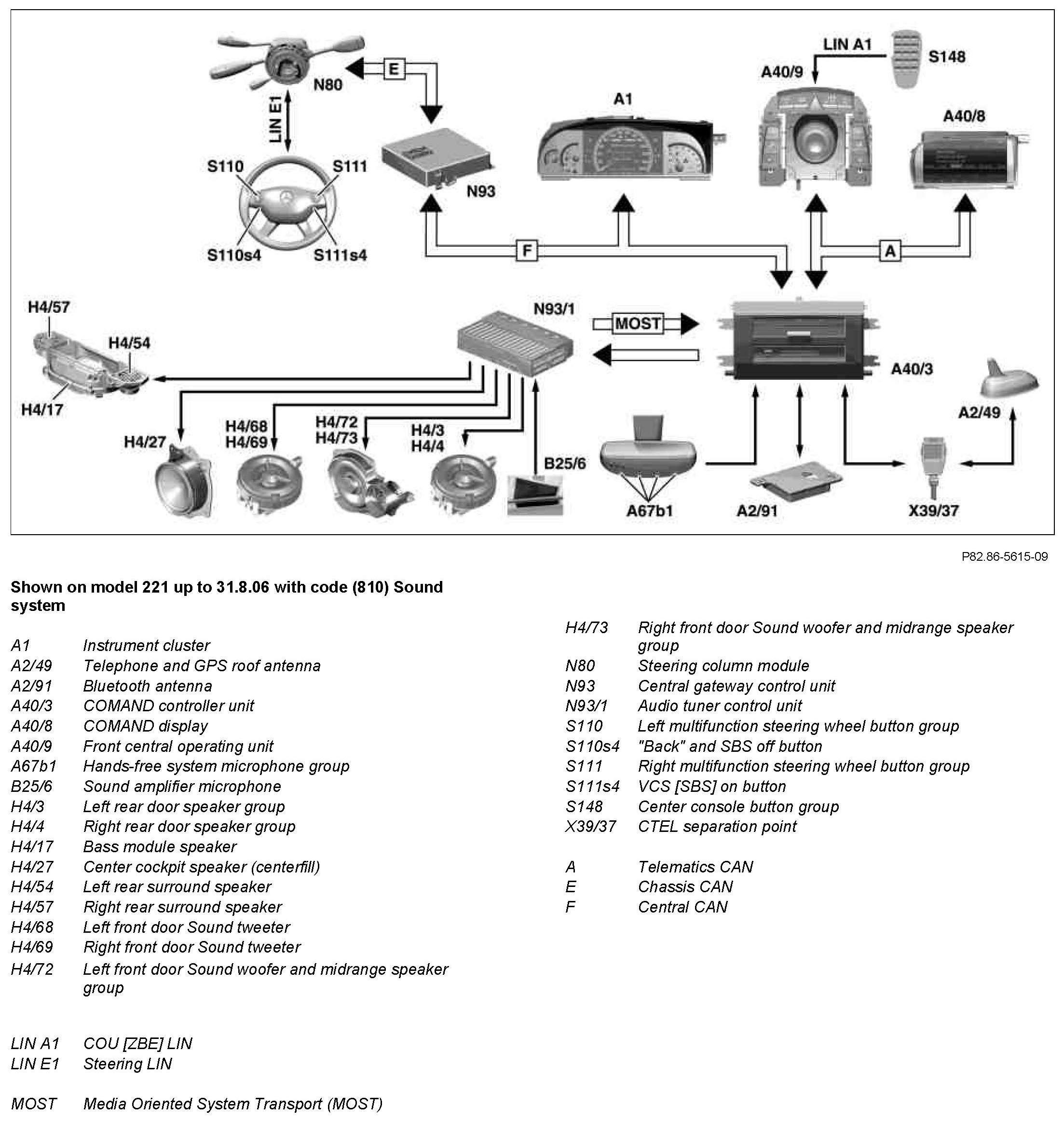 The navigation data are compiled in the navigation processor where they are processed. The data basis is the navigation map, which is stored on the hard disk in the COMAND controller unit. The data are then internally processed and displayed on the COMAND display or in the instrument cluster. The audio signals are sent from the COMAND controller unit over the MOST to the audio tuner control unit and from there to the speaker system.