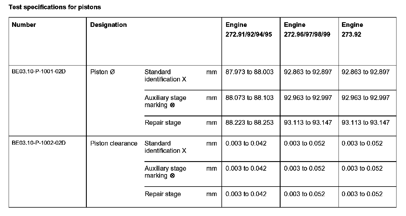 Test specifications for pistons: