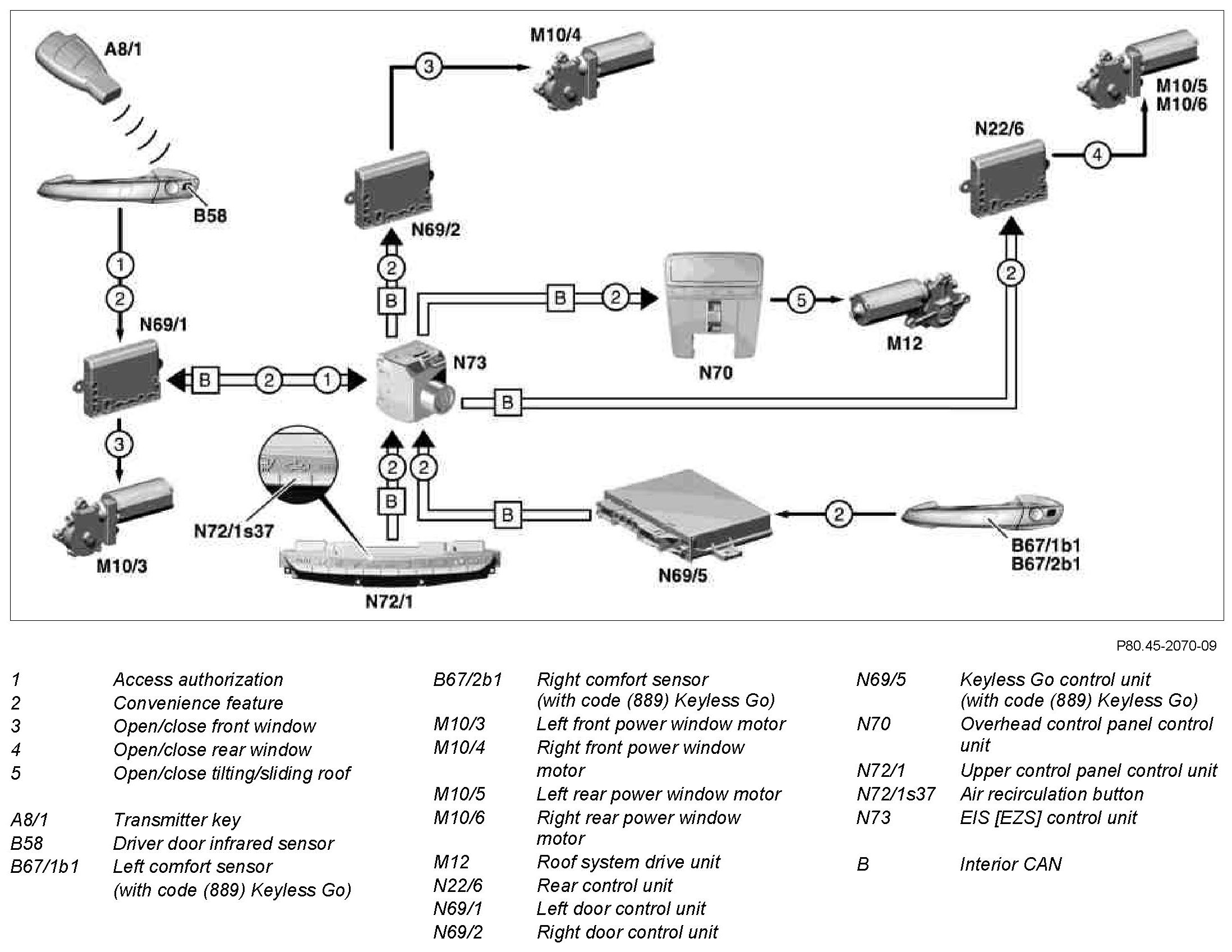 When a comfort sensor is touched, it transmits a signal to the Keyless Go control unit. The Keyless Go control unit then transmits the "Convenience feature" command to the door control units, the rear control unit and overhead control panel control unit for the duration of the actuation via the interior CAN.