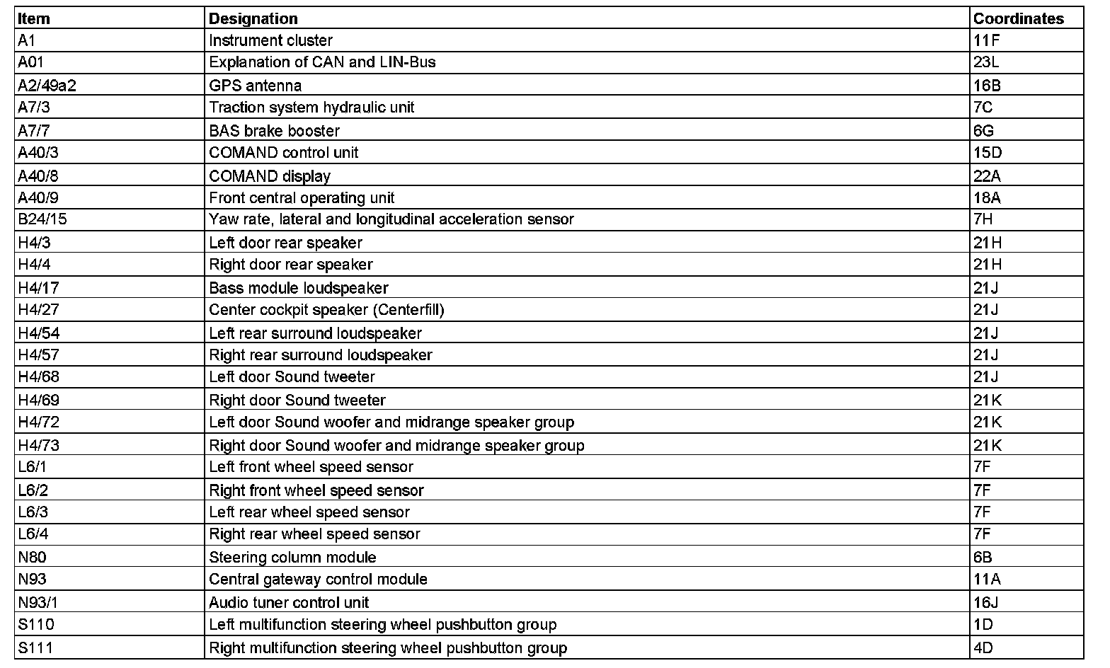 Component Description/Coordinates, A1 To S111: