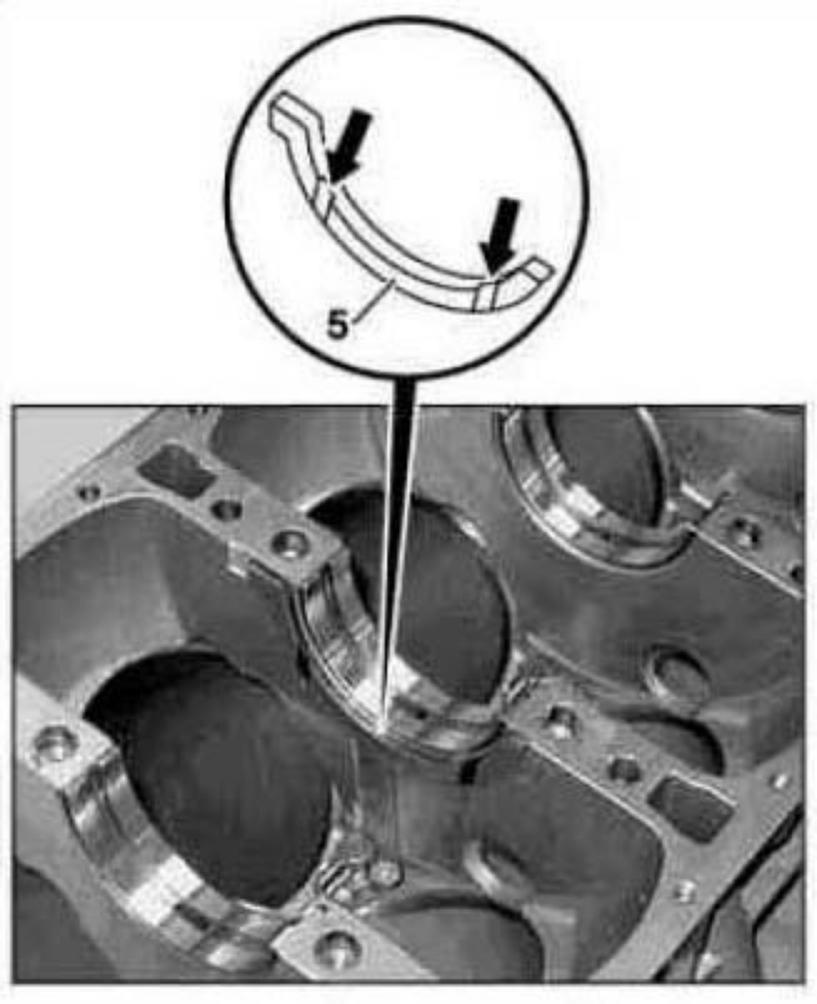 4 Insert thrust plates (5). m The oil grooves (arrows) must be pointing toward the contact surface of the crankshaft and be oiled.