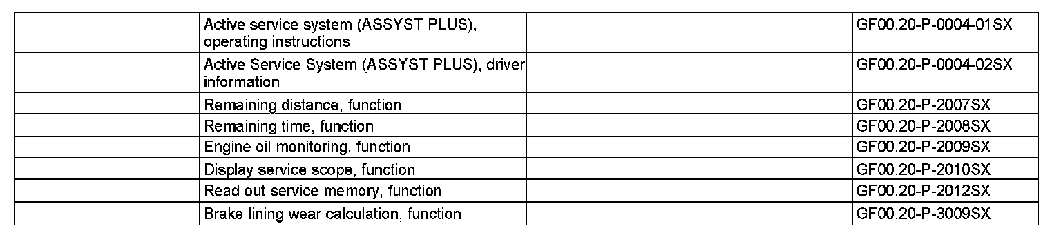 The Active Service System PLUS (ASSYST PLUS) calculates the service date and determines further maintenance items. ASSYST PLUS uses measurements or values derived from measurements as well as data stored in its read-only memory to calculate the next service date for the vehicle. Both distance-related and time-related variables are taken into account. ASSYST PLUS can be configured, enabling it to be adapted to various vehicle uses. This is implemented in the central gateway control unit (N93). The central gateway control unit is connected via the central CAN, the chassis CAN and the drive train CAN to the following control units of the vehicle: