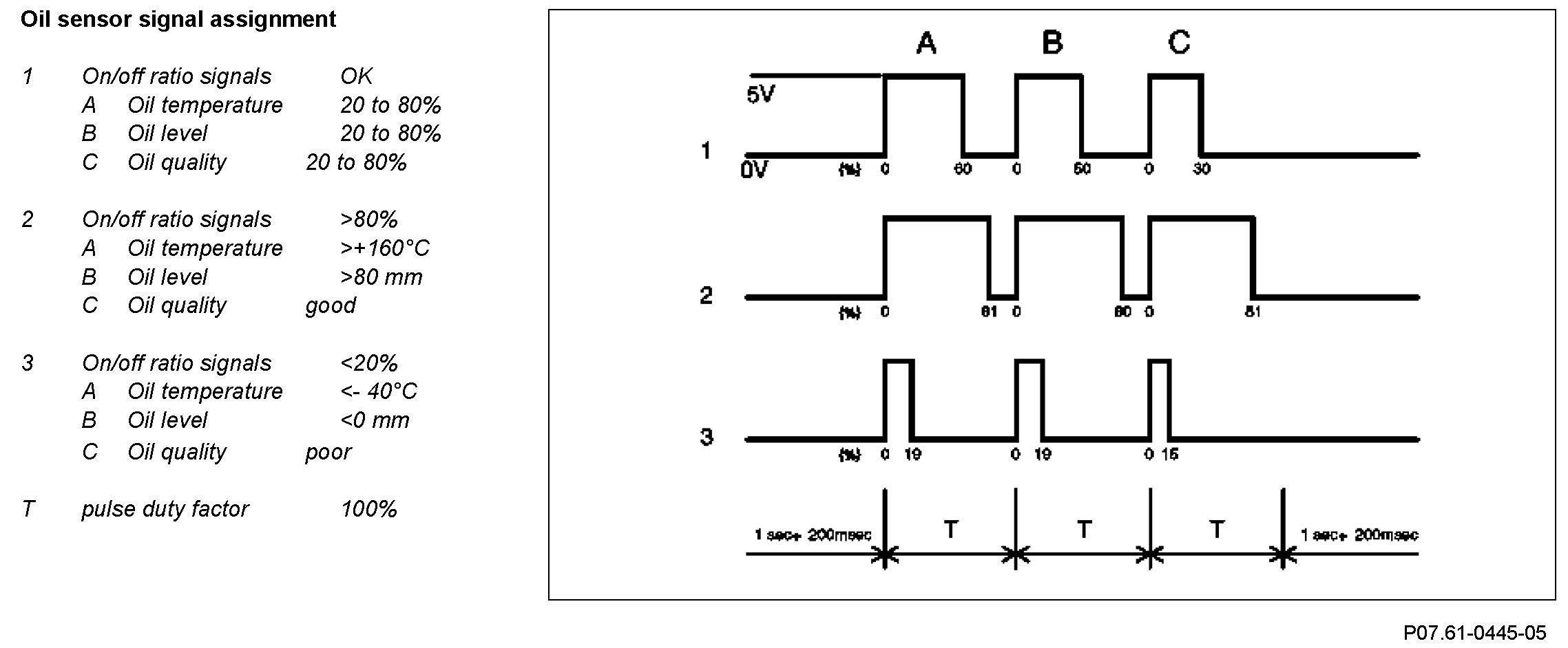 The oil sensor, which functions according to the capacitive measuring principle, has integrated electronics, which process the three signals into one PWM signal (pulse-width modulate signal).