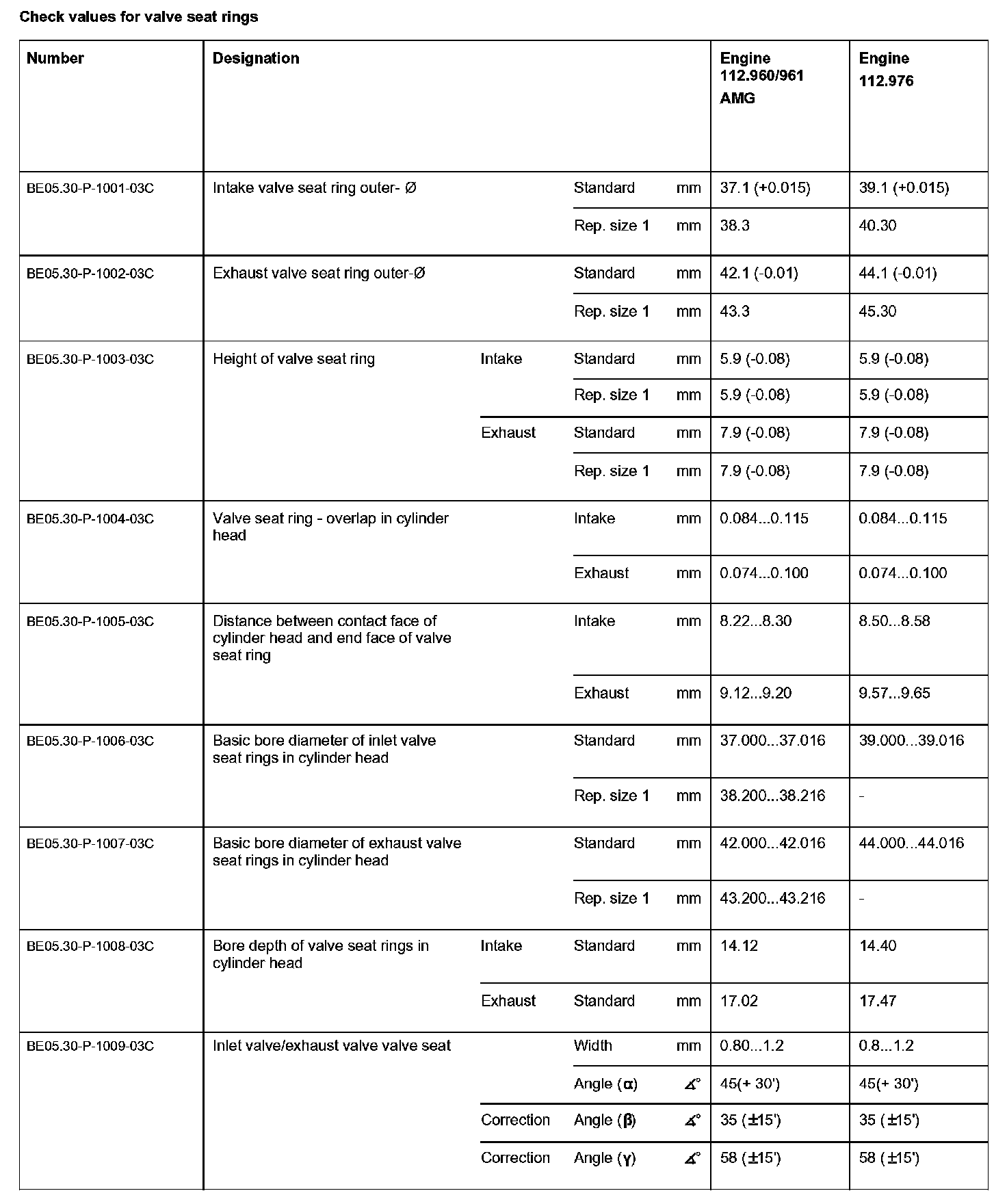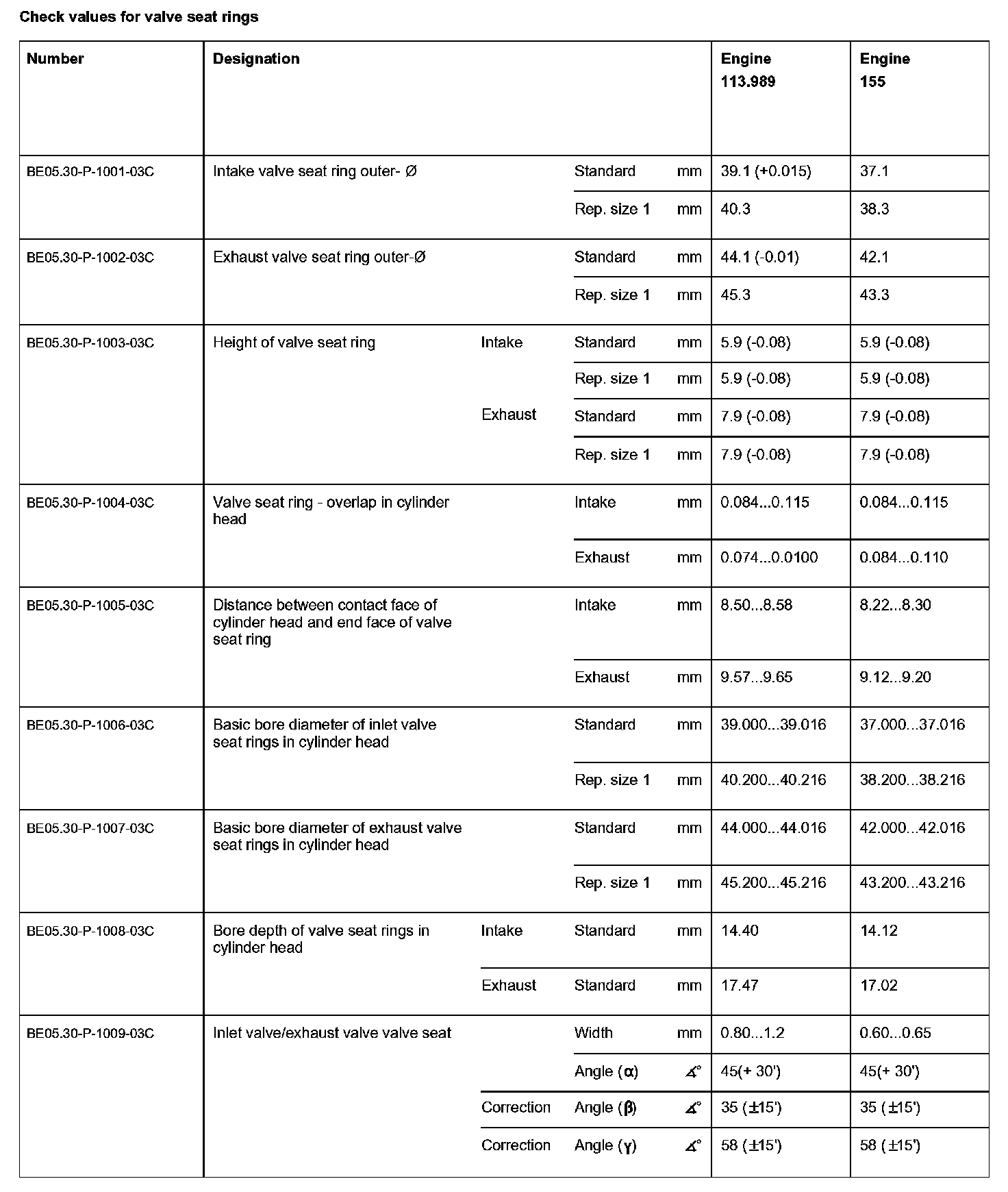Check values for valve seat rings: