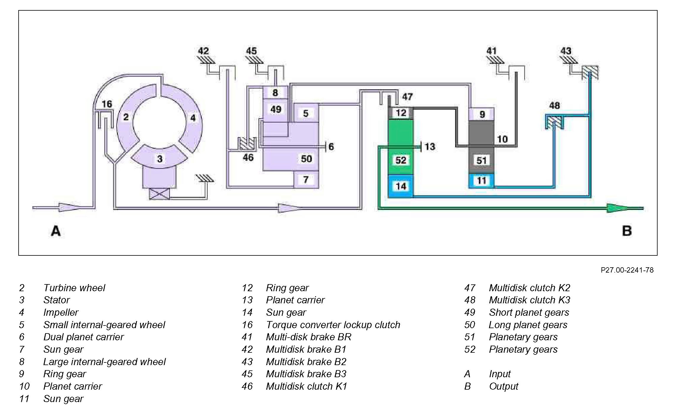 The internal-geared wheel (12) has a mechanical connection to the planet carrier (10) and rotates at the same speed. The planetary gears (52) roll on the stalled sun gear (14) and transfer the increased torque and reduced rotational speed to the transmission output shaft via the planet carrier (13). The transmission output shaft thus rotates with reduced transmission input speed in the direction of rotation of the engine.
