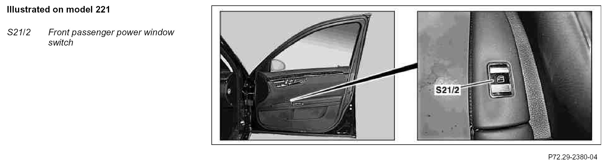 The power window switch transmits the adjustment requests for the right front power window motor (M10/4) to the right front door control unit (N69/2) (model 221) or the right door control unit (N69/2) (model 216) using voltage-coded signals.