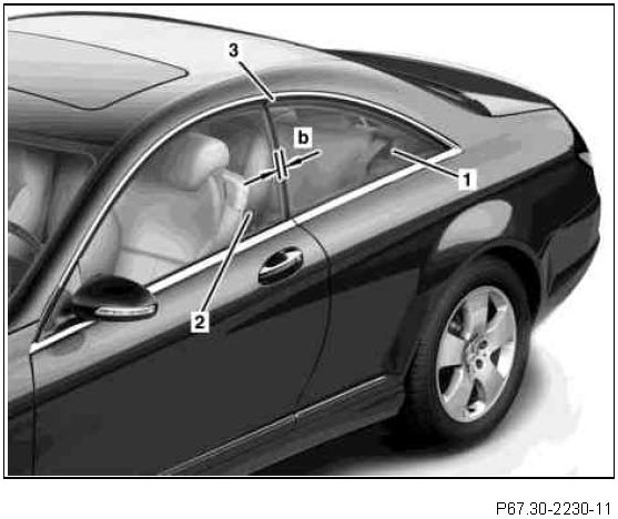 The rear side window (1) should make contact at the front of the power window mount.Adjust parallel to retaining rail on roof frame seal (3) by raising or lowering at the rear lift support point.