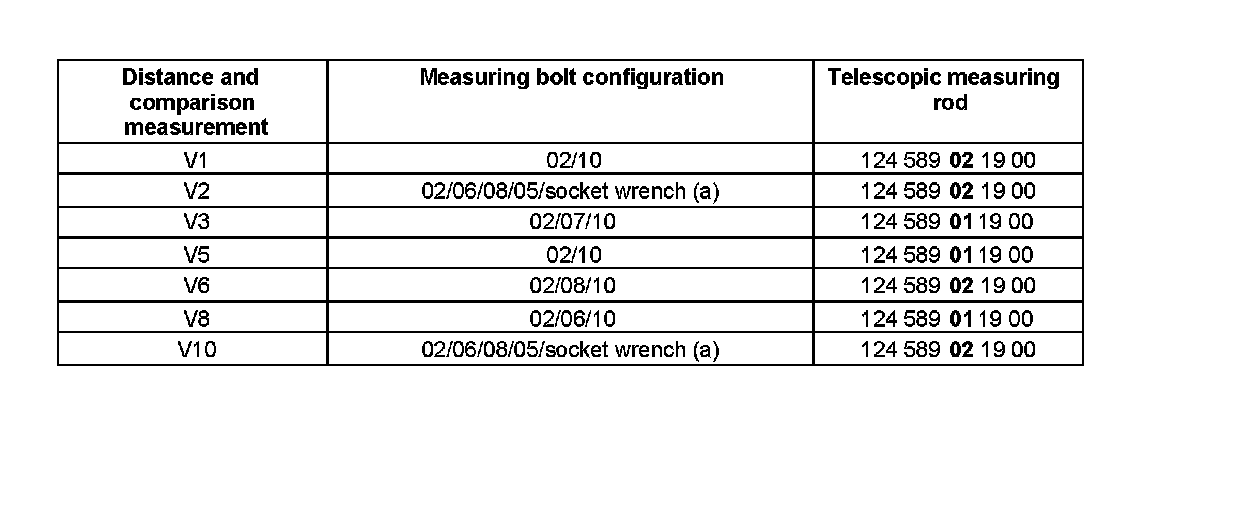 The construction of the measuring bolts is shown in the table, where the numbers in the column headed "Measuring bolt construction" are the special tool end numbers