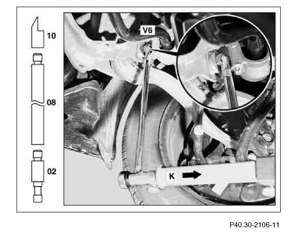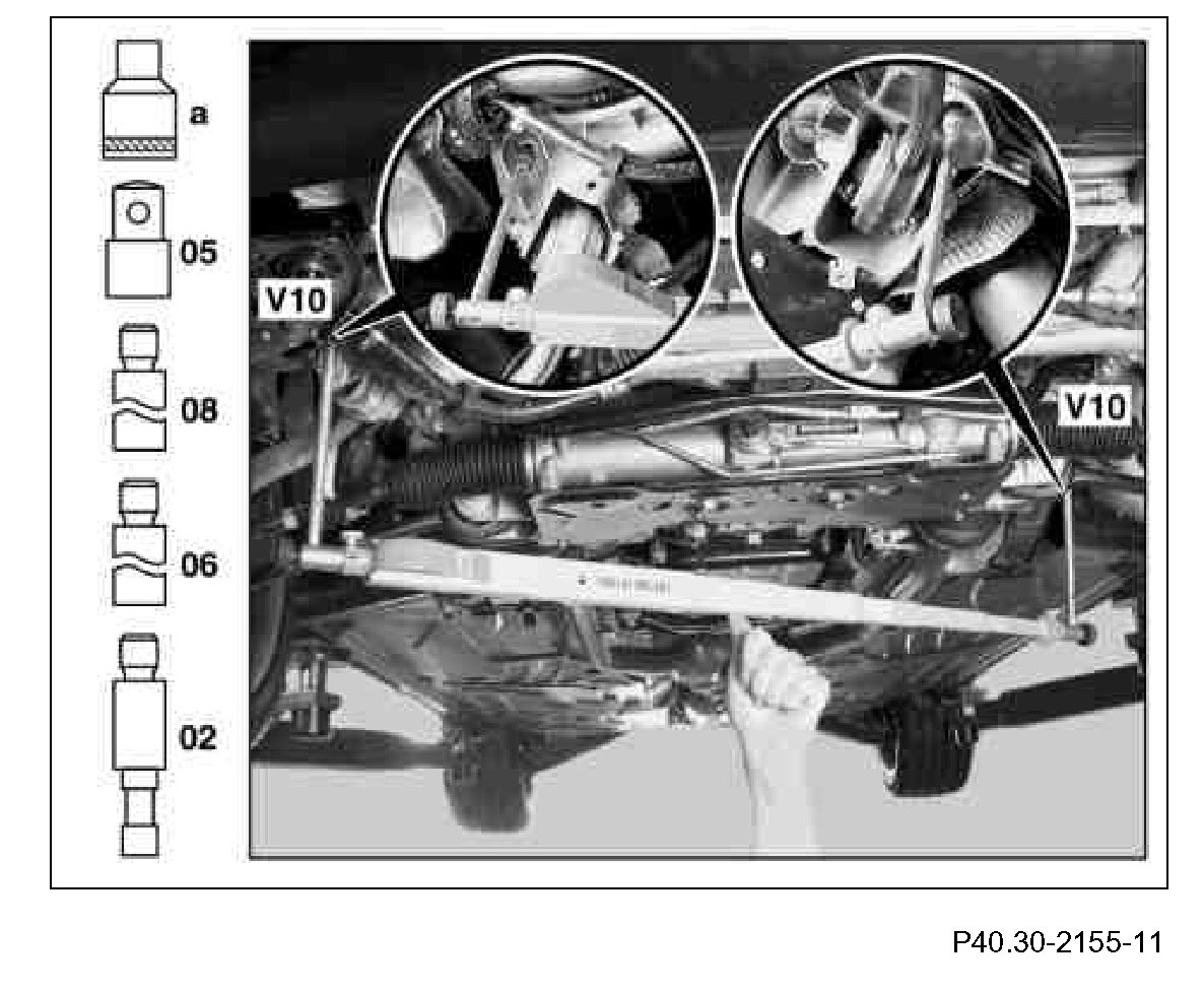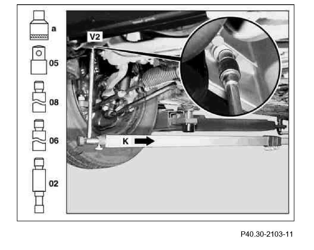 Measured from check bore (K) to the ball head bolt on the torque strut (18), left to right. The bearings at the tension arm and cross strut must be in perfect condition in order to assess the consequences of an accident. Because of the inaccuracies resulting from the tolerances of the bearings, the dimension (V1) is only usable to a certain extent.