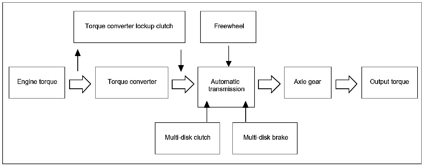 The term power flow refers to the transmission of propulsion power and engine torques. The engine torques are transferred to the drive wheels by means of the mechanical-hydraulic connection between the engine, torque converter and automatic transmission. The torques are converted in the transmission by several planetary gear sets.